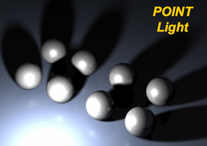 Point lights are like light bulbs where the light emanates in all directions from a central spot. Notice how the shadows go off in different directions. Also notice how the shadows become softer the further from the object they get.