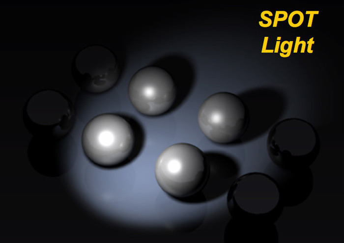 Spot lights can be aimed, like a flashlight, and have similar shadow qualities to the point light. Spot lights focus the light onto one area.