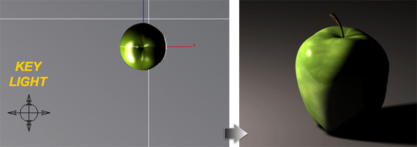 When placing this light, consider where you would like most of the light on your object, and likewise, where the main shadow will fall. For example, will the main lighting be from the left of the object with the shadow falling to the right, or will the light be on the right with the shadow falling to the left? Usually this light should be situated fairly high above the model, around 45 to 60 degrees relative to the ground, if you were to draw an imaginary line from the center of the light to the center of the object and then measure the angle.