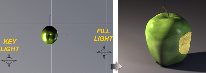 Since the main light will now cast a very harsh, dark shadow and a high contrast between the lit and unlit sides of the object, the fill light comes to the rescue to brighten those dark areas a bit.