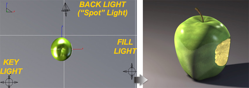 Use the point light for this and place it somewhere on the back side of the object so that it creates a highlight area along the back and top of the object. This light can be bright, possibly even as bright as the main light. Just make sure that it doesn’t cause a shadow that competes with the main shadow. Sometimes it is helpful to shut the shadow off altogether on this light.