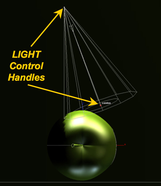 Use Edit>Show Points just like you do with other objects in Ashlar-Vellum software, such as lines or splines. Now you will see some control points on the light that can be selected and dragged. Select the one that is out in front of the light, and then drag that until it points where you want it.