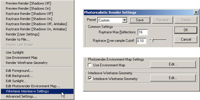 To edit the Interleaved Wireframe Geometry options, select Interleave Wireframe Geometry from the PhotoRender menu or press the Edit button next to Interleave Wireframe Geometry in the Photorealistic Render Settings window.