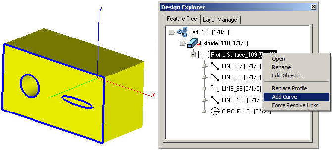 Using Context Menu within Feature Tree it is possible to add, remove or replace elements in profiles of the Extrude, Skin, Lathe, Cutout, Protrude, Boss or Hole tools of 3D models.