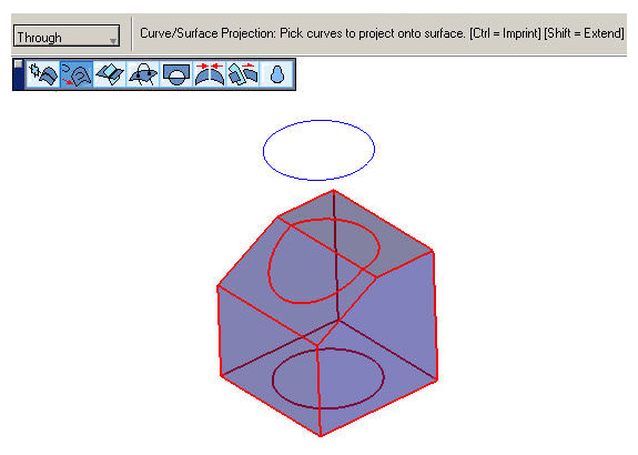 The Curve/Surface Projection tool now supports projecting and imprinting curves onto surfaces and solids. Options in the Message Line for the Curve/Surface Projection tool now include To Entity and To Face, in addition to Through: