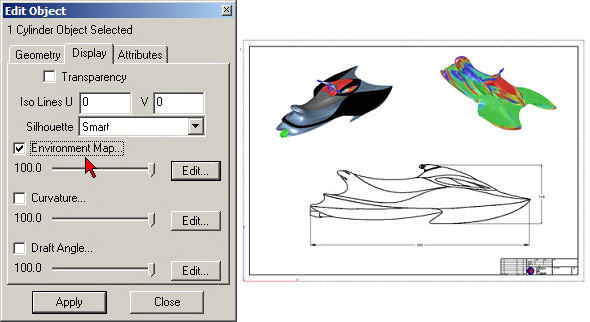 In version 8 of our 3d modeling programs, the surface analysis tools, such as curvature, draft angle and real-time environment maps are now part of the Edit Object dialog box. These methods can be combined or applied individually to objects in a scene.