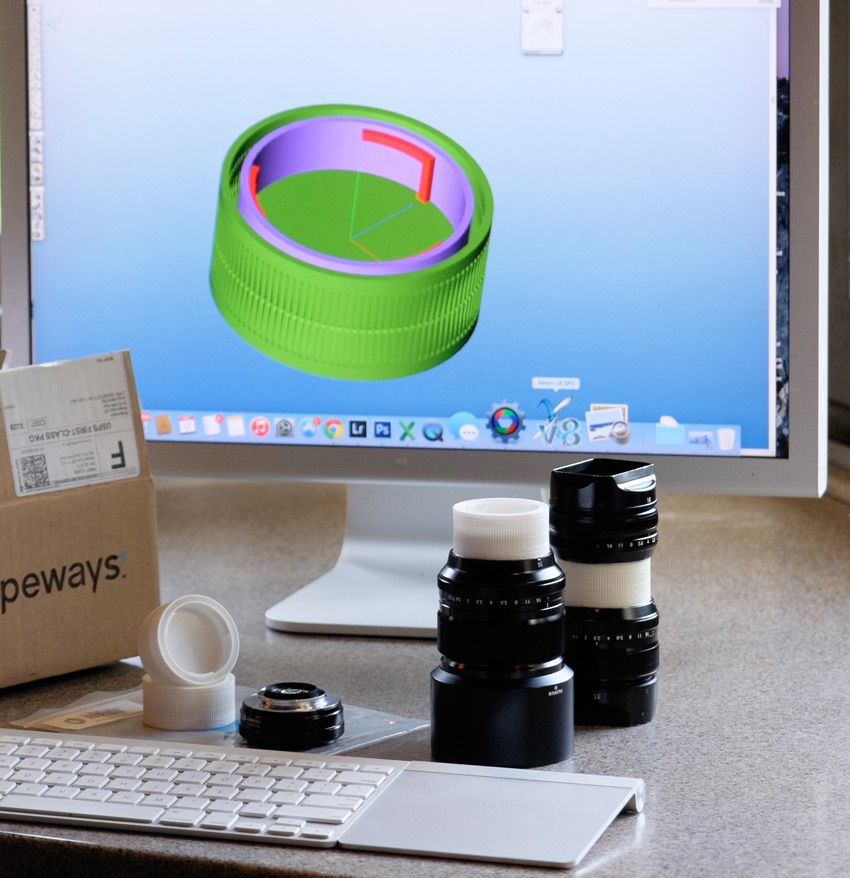 Like many photographers, Krebs is always juggling between lenses. A double-ended lens cap makes it easier for photographers to change lenses with one hand without worrying about dropping their valuable equipment. Unfortunately, since the Fujifilm X CSC was so new, it wasn’t likely one was available. Krebs saw this as an excellent opportunity to model something and upload it to Shapeways for a one-off 3D print. It was only after he’d quickly modeled the lens cap in Xenon and got a price from Shapeways that he searched the web and confirm that indeed a double-ended lens cap was not available from anyone for the more compact camera.