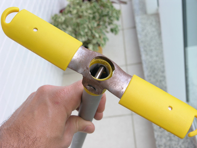 Next, they needed a handle that made it easy to bore the tip in the sand. Again, the first design, a crank, was rejected in favor of a lever that flipped into place allowing both hands to screw it into the beach. Flip the handles into the vertical position and the top portion of the shaft with the umbrella snaps into place with a twist.