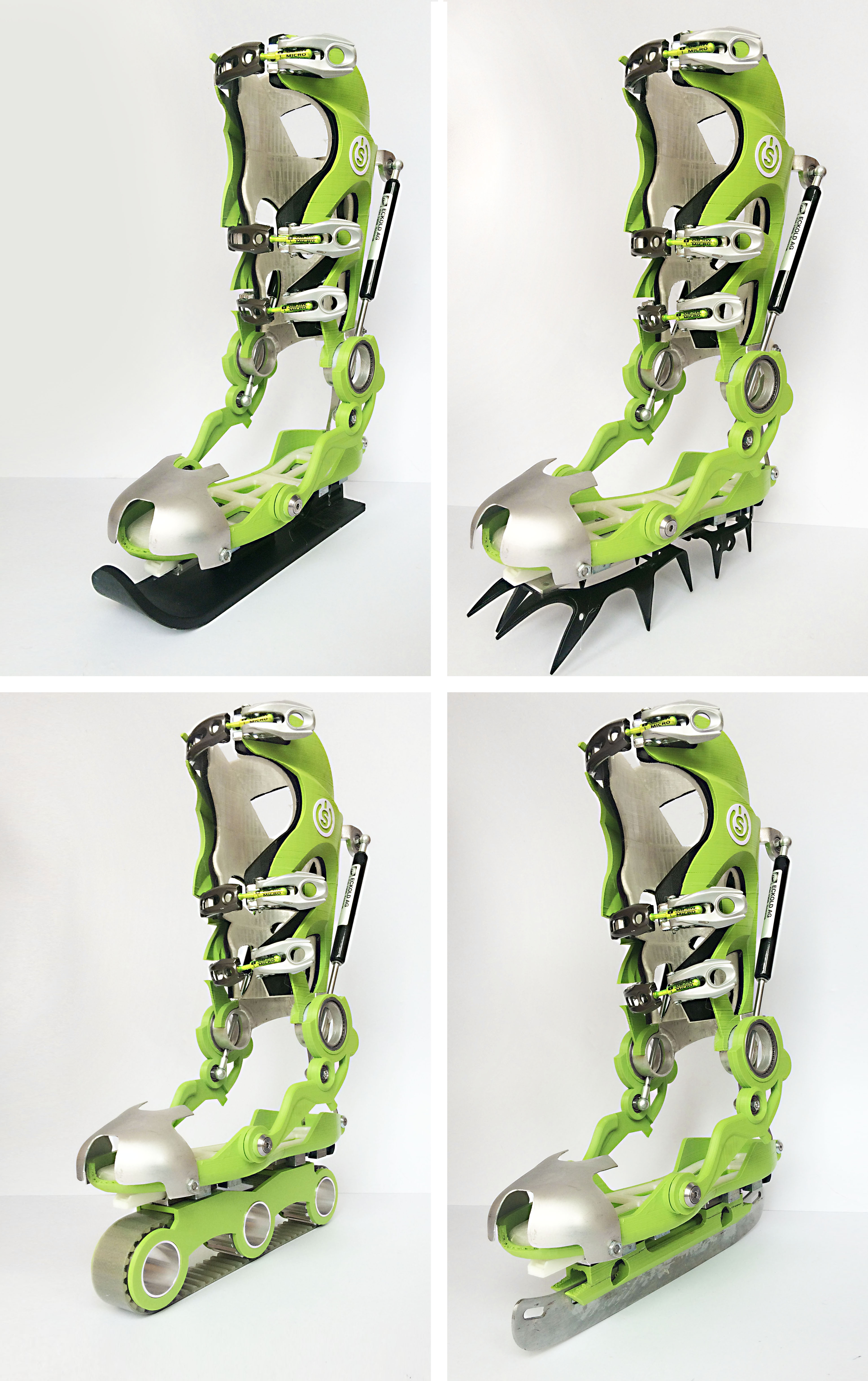 Better yet, the rollers can be easily exchanged with four optional adapters including ice blades, mini skis, ice climbing crampons and caterpillar tracks for descending grassy meadows or gravel paths.