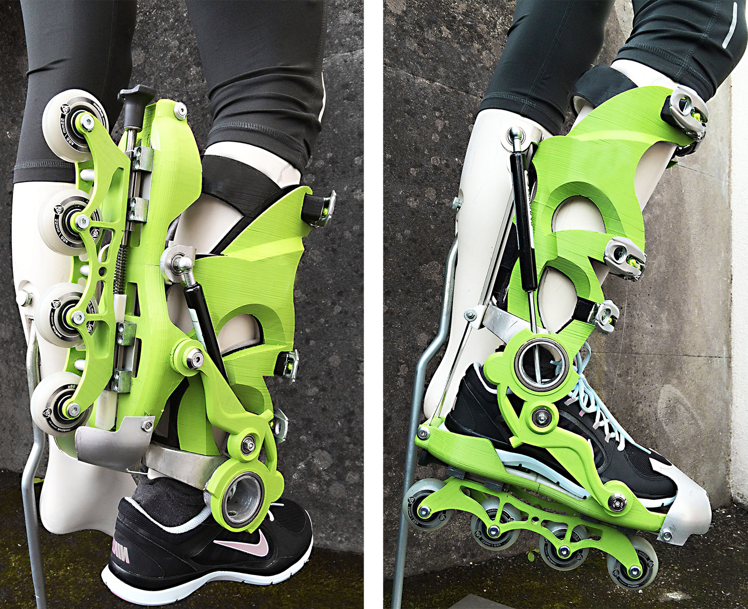 But this design team in Luzern, Switzerland has changed all of that with the PowerSwat. Strapped to the calf over any type of street shoe, the PowerSwat folds backwards at the touch of a button, clicking into place behind the ankle. Later, with a gentle touch the rollers move down again into place and the toe clip clicks around the foot, offering a secure fit.